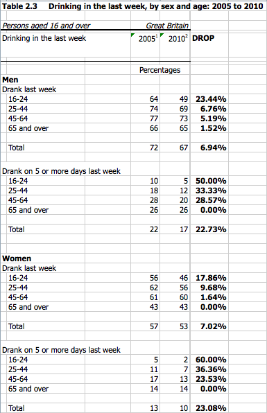 every other category, people were drinking less, with the biggest drops in the 16-24 age bracket. Only a third of young men exceeded 4 units (2 pints of Tetley's), and only a quarter exceeded 8 units (3 pints of Kronenbourg), down from about a half and a third, respectively, in 2005.